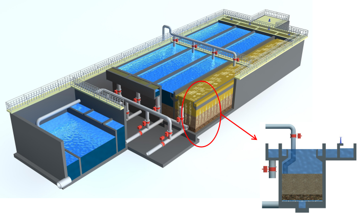 反硝化深床濾池特別適用于市政污水廠的提標改造,例如:從一級B標準向一級A標準的提升,從一級A標準至地表類水的提升。